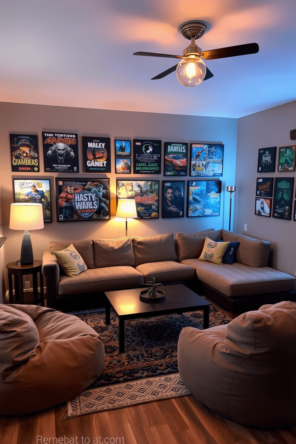 The cozy game room is designed with plush seating, including a large sectional sofa adorned with soft throw pillows. The walls are decorated with framed gaming posters, while ambient lighting creates a warm glow, enhancing the overall inviting vibe of the space.