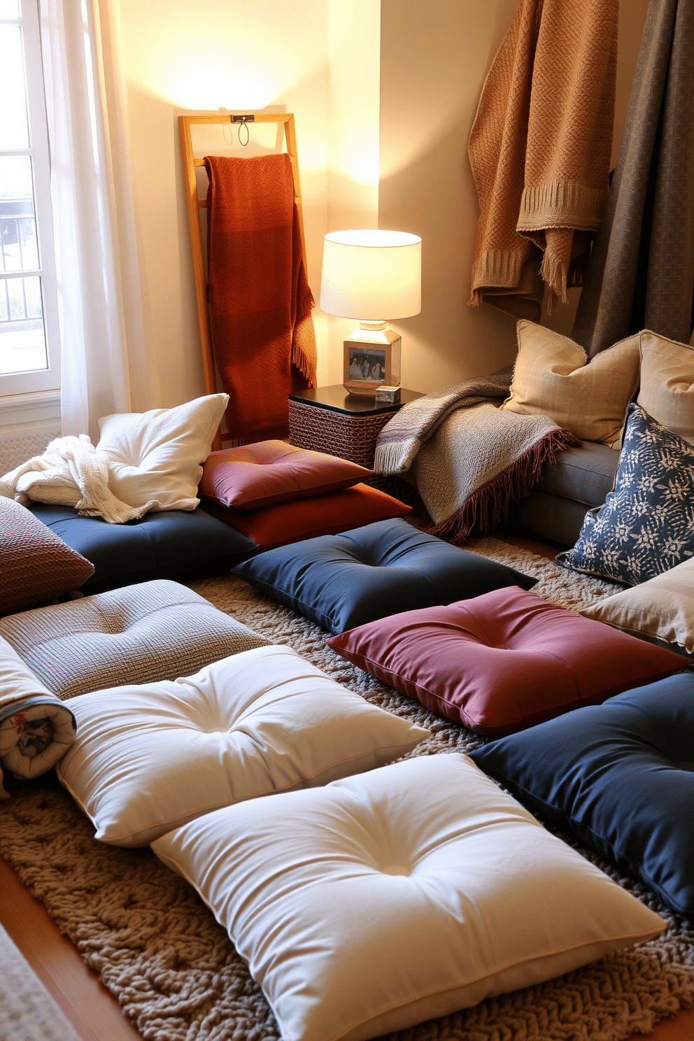 A cozy living room featuring an inviting arrangement of floor cushions in various textures and colors, providing extra seating for guests. The space is adorned with a plush area rug, warm lighting from a stylish floor lamp, and a mix of soft throw blankets and decorative pillows to enhance comfort and style.