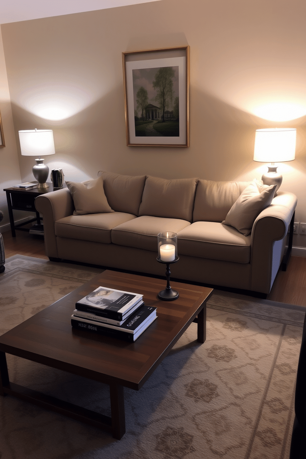 A cozy living room featuring warm mood lighting created by soft table lamps placed on either side of a plush, oversized sofa. The walls are painted in a soft beige, and a large area rug with subtle patterns anchors the space, complemented by a wooden coffee table adorned with decorative books and a scented candle.