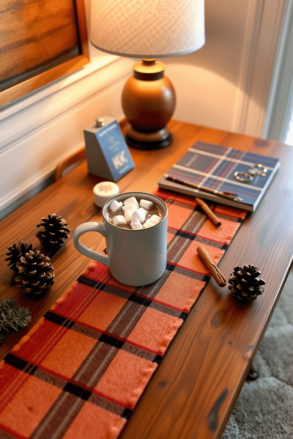A cozy hot cocoa station is set up on a rustic wooden desk adorned with a warm plaid table runner. A stylish ceramic mug filled with rich hot cocoa sits beside a small pot of marshmallows and a sprinkle of cinnamon.