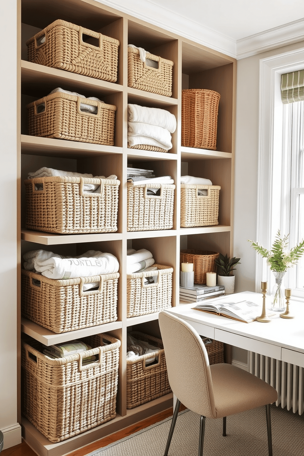The home office features a sleek desk positioned near a window, allowing natural light to flood the room. Soft, neutral tones dominate the decor, complemented by a few decorative items like candles and a small potted plant for a touch of greenery.