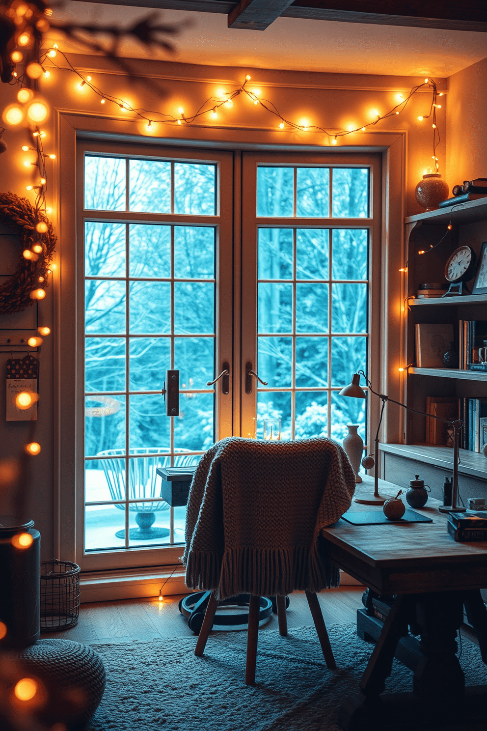 A cozy winter home office filled with warm lighting. Soft fairy lights are draped across the windows, creating a magical ambiance.
