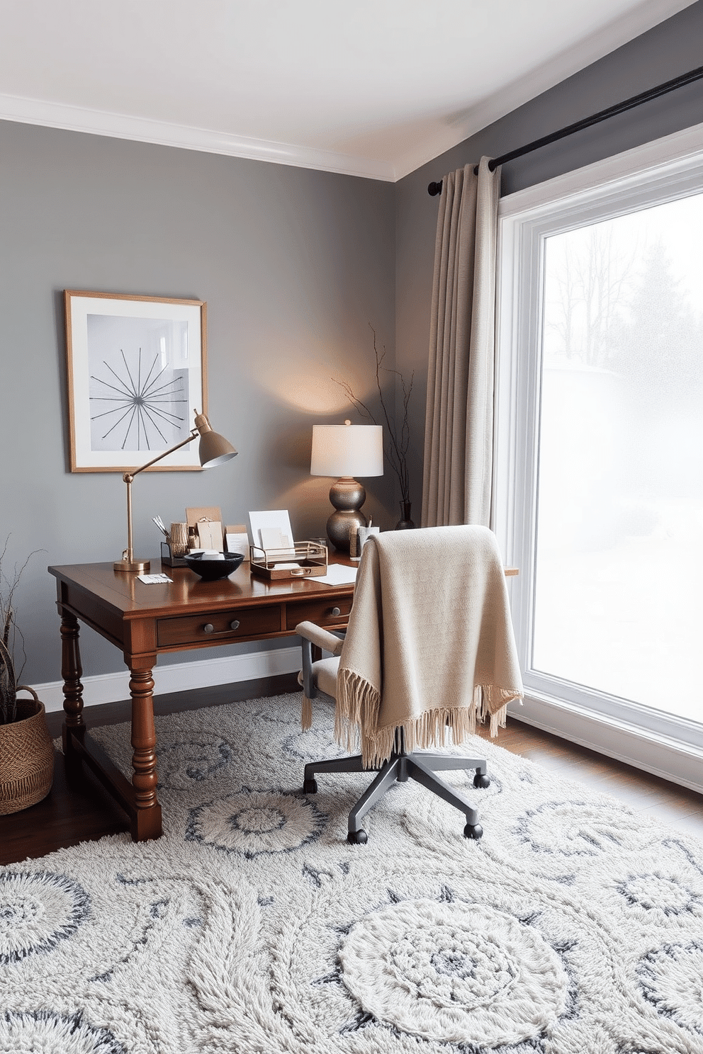 A cozy winter home office features layered textiles that invite warmth and comfort. Plush throw blankets drape over a soft armchair, while a patterned area rug adds texture beneath a sleek wooden desk.