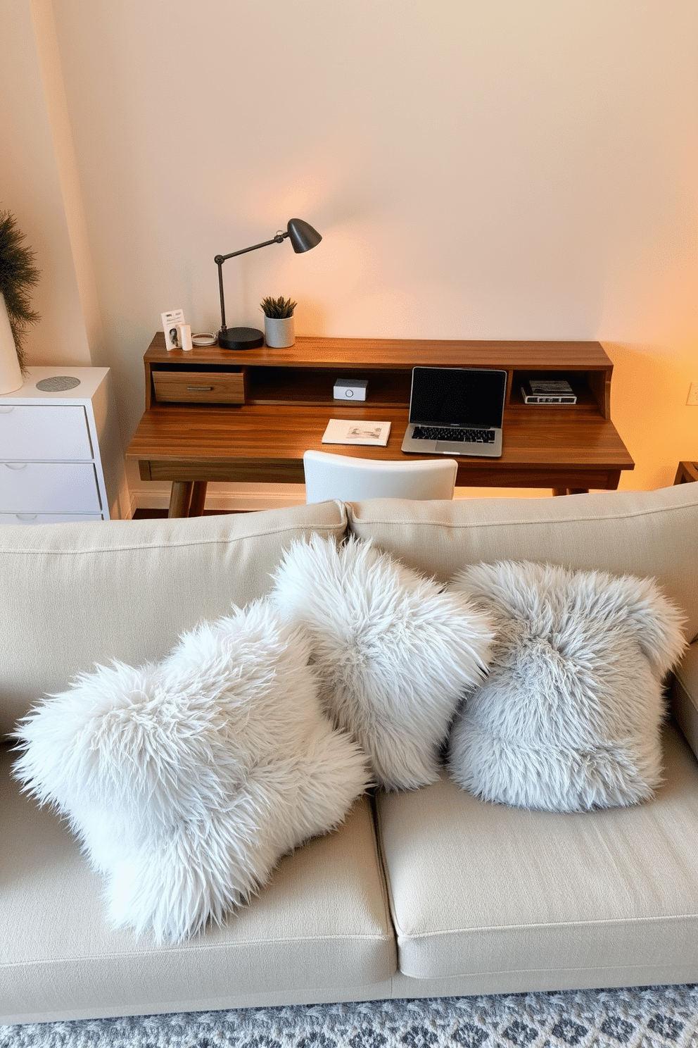 On the sofa, there are plush faux fur throw pillows in soft shades of white and gray, inviting relaxation. A soft area rug in neutral tones lies beneath the desk, enhancing the comfort of the room.