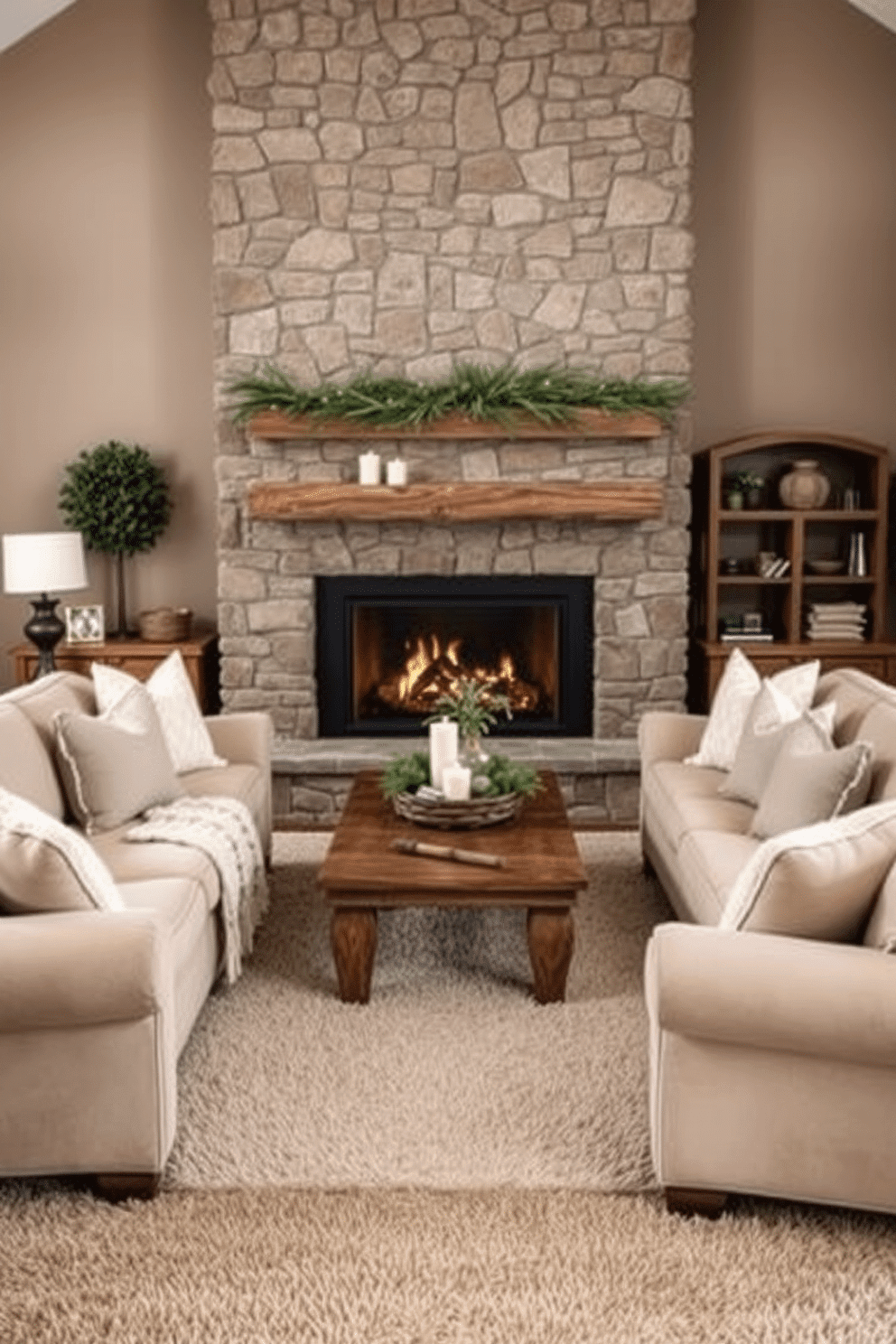 A large stone fireplace serves as the focal point, with a wooden mantel decorated with seasonal greenery and candles. The walls are painted in a soft taupe, and a thick area rug in muted tones anchors the space, adding warmth and texture.