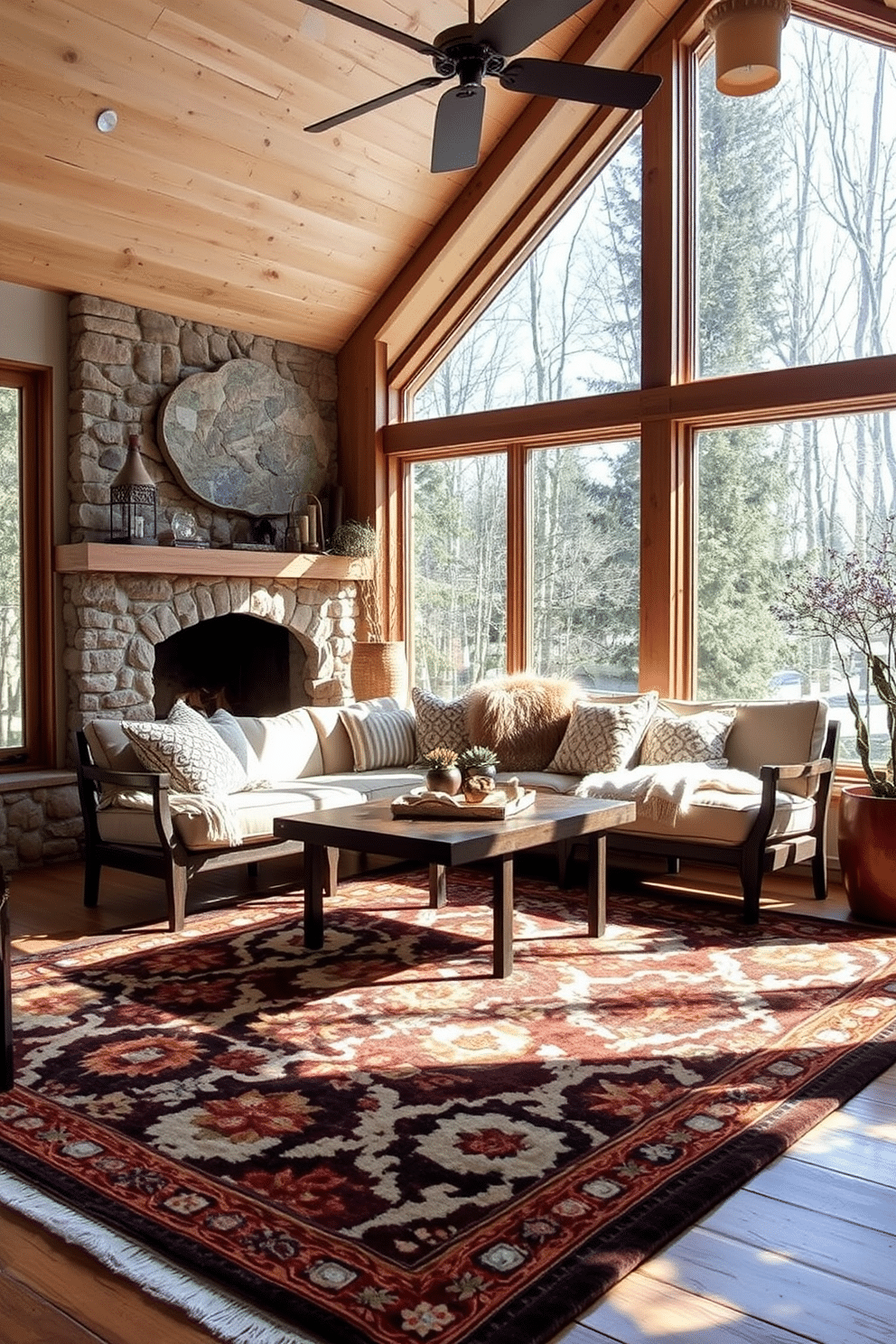Incorporate natural materials like wood and stone to enhance the warmth of the space. Large windows allow natural light to flood in, illuminating the layered rugs and creating a welcoming environment.