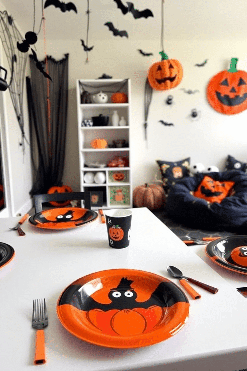 Festive Halloween-themed tableware for snacks. The table is adorned with black and orange plates featuring ghost and pumpkin designs, complemented by matching napkins and cups.