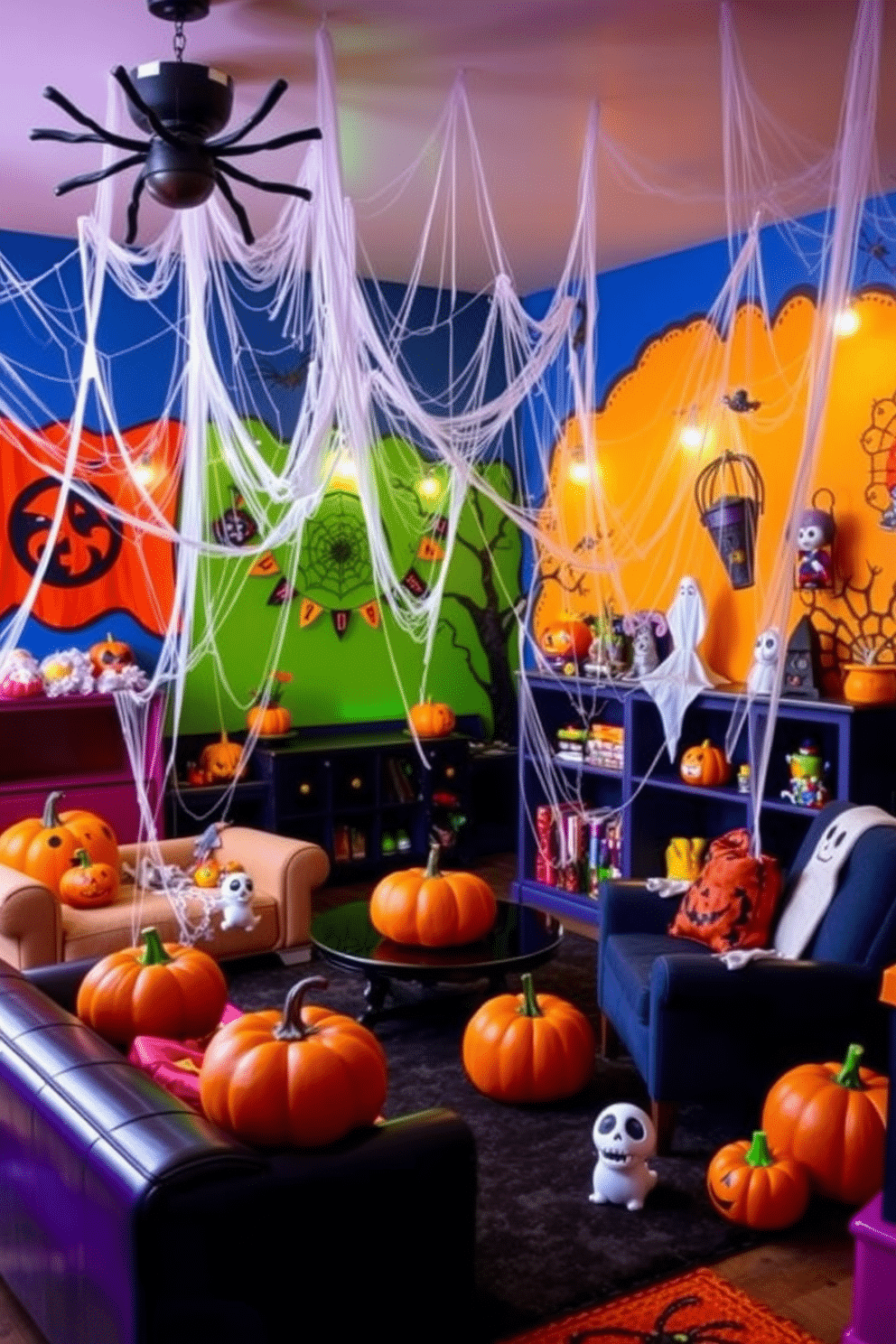 A whimsical Halloween playroom filled with vibrant colors and playful decorations. Spiderwebs draped over furniture create an enchanting atmosphere, while colorful pumpkins and ghostly figures add a festive touch.