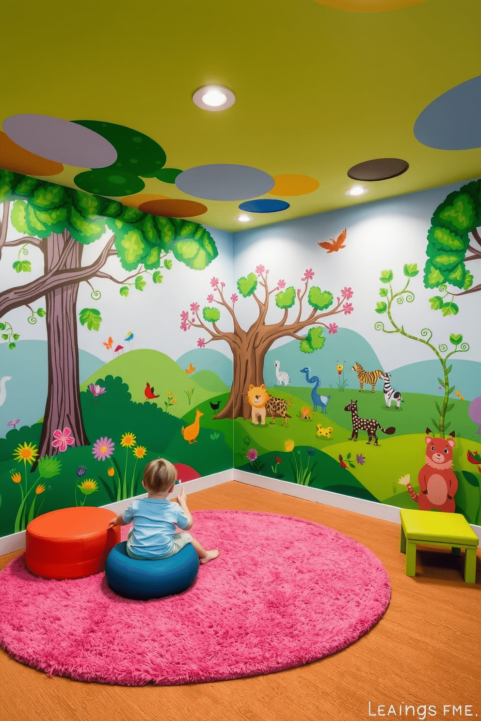 A vibrant playroom filled with colorful wall murals depicting whimsical scenes, such as a magical forest and playful animals, creating an imaginative environment for children. The space features soft, plush rugs and comfortable seating, encouraging creativity and exploration through play.