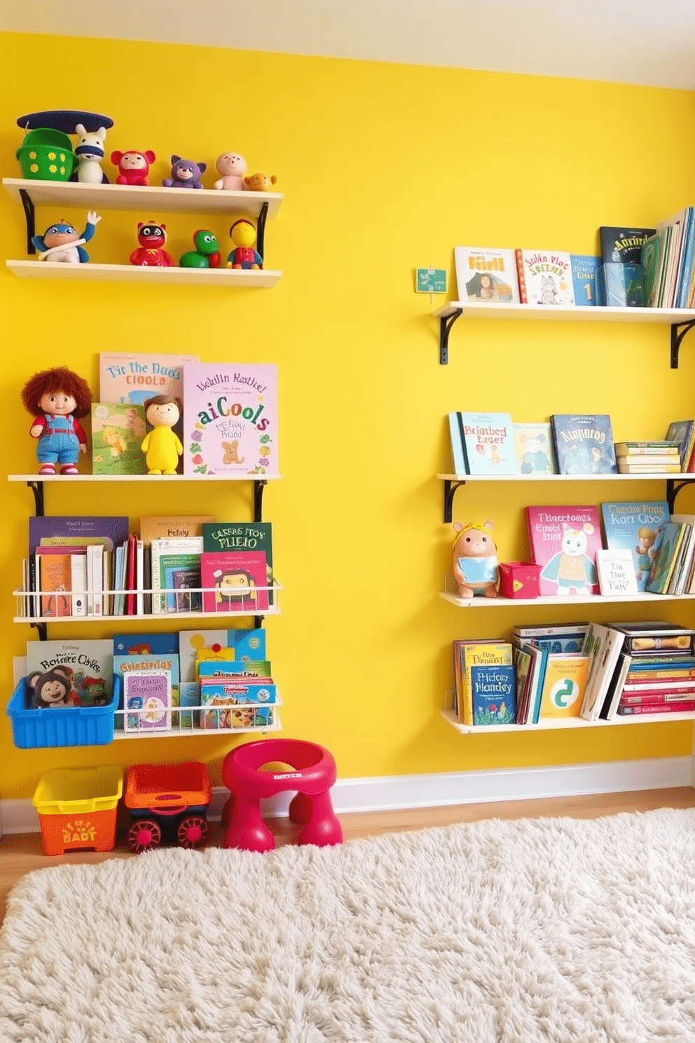 A vibrant kids’ playroom featuring wall-mounted shelves filled with colorful toys and books for easy access. The walls are painted in a cheerful yellow, and a soft, plush rug covers the floor, providing a cozy space for play.