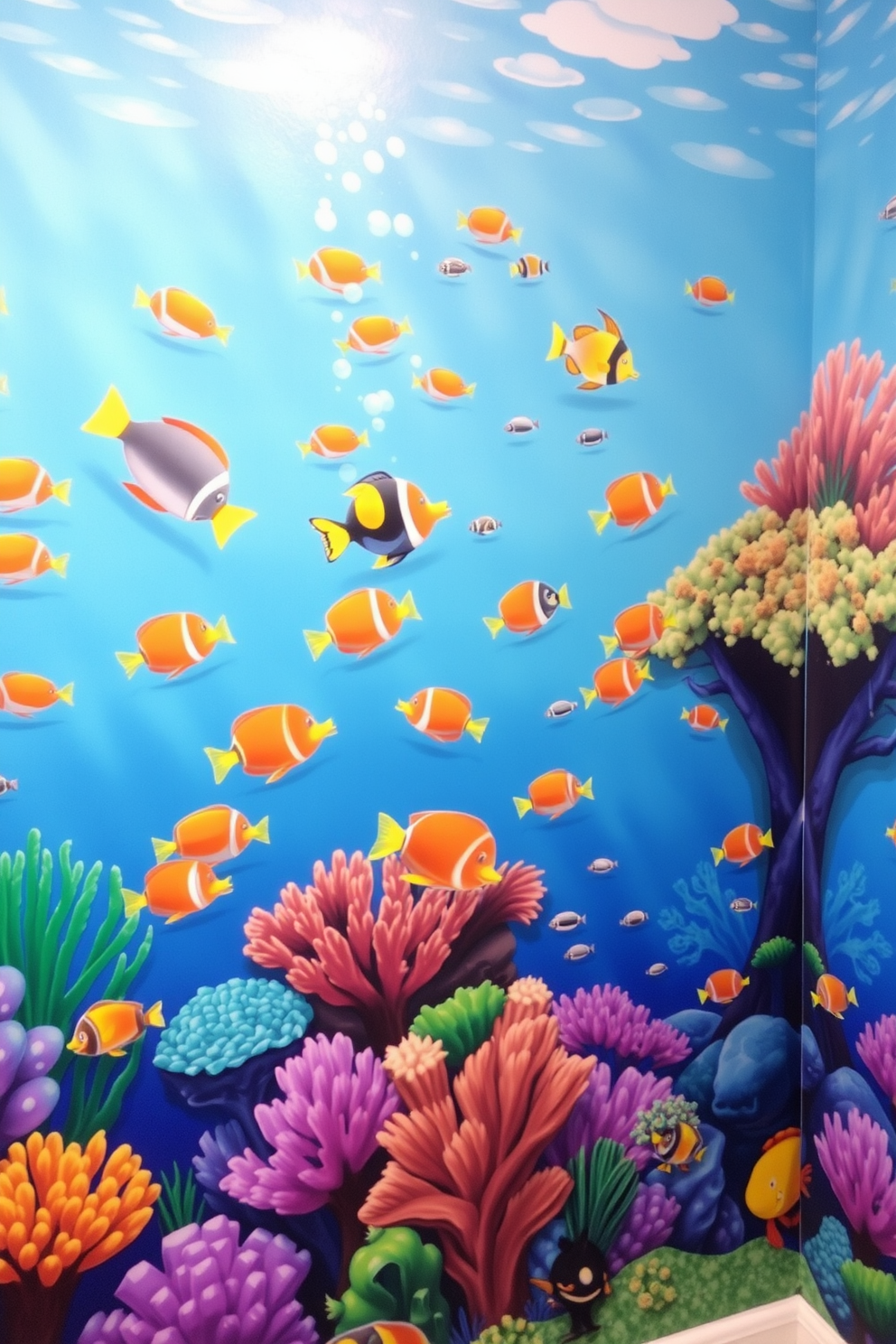 A whimsical kids room wall painting features playful sea creatures like smiling dolphins and friendly turtles. Bright colors and imaginative designs create a joyful atmosphere that sparks creativity and wonder.