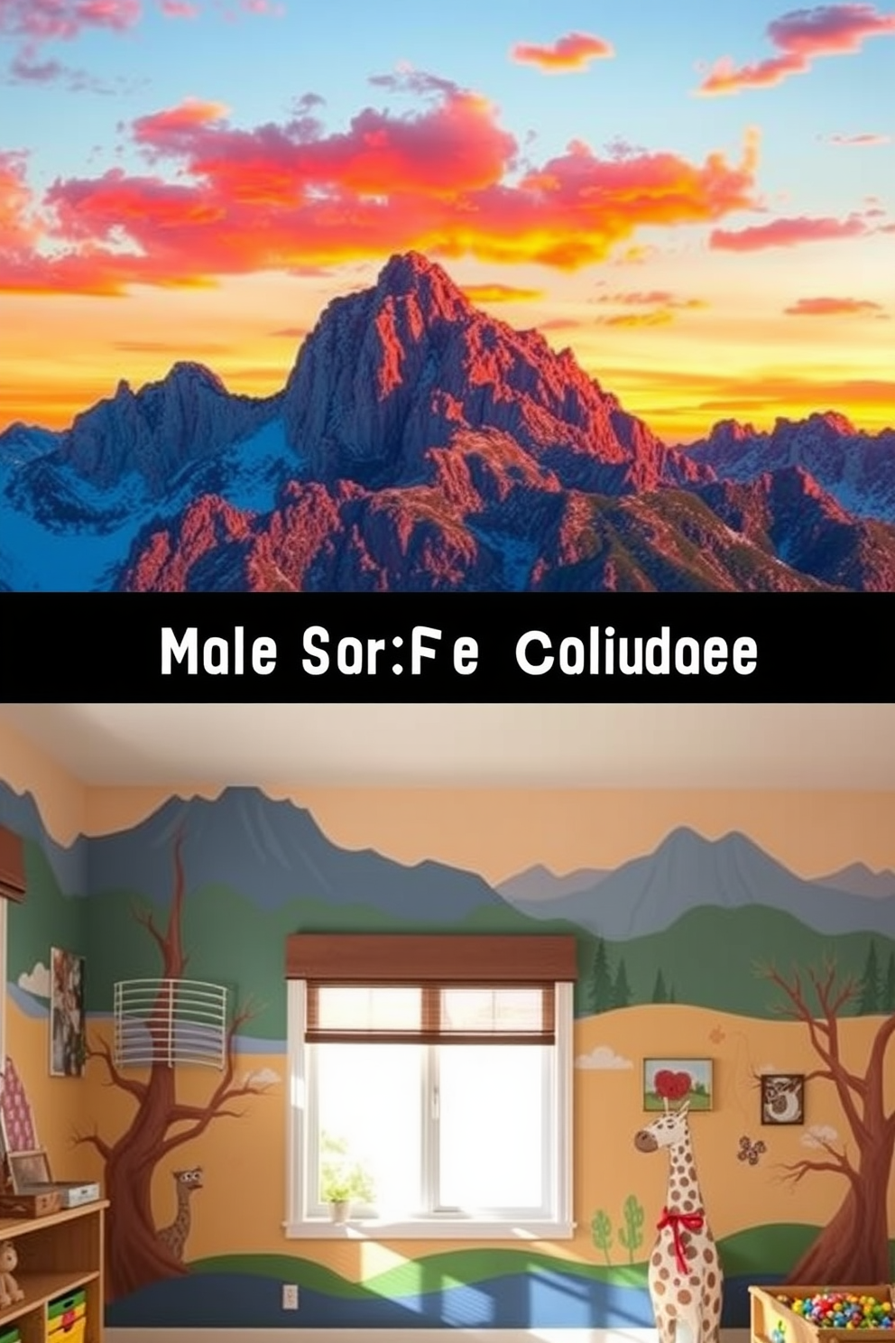 Incorporate elements like fluffy clouds and whimsical stars to enhance the dreamy atmosphere. The overall design should inspire creativity and joy, making the room a magical space for kids to explore and play.