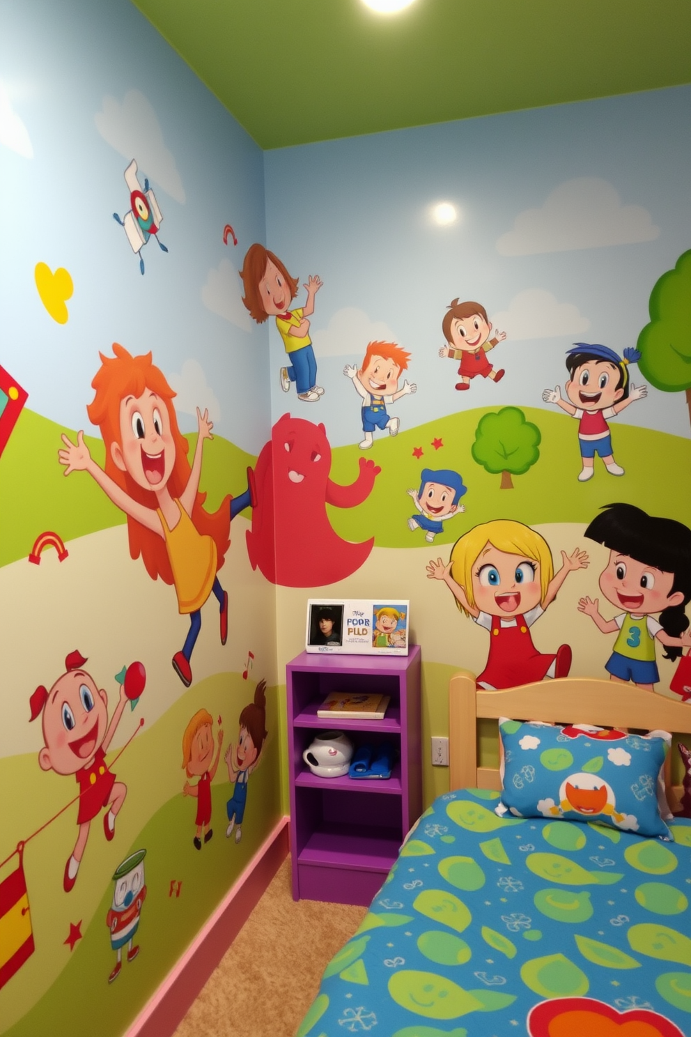 A vibrant and whimsical kids room featuring cartoon characters in playful poses. The walls are adorned with colorful murals depicting various characters engaged in fun activities, creating an inviting and cheerful atmosphere.