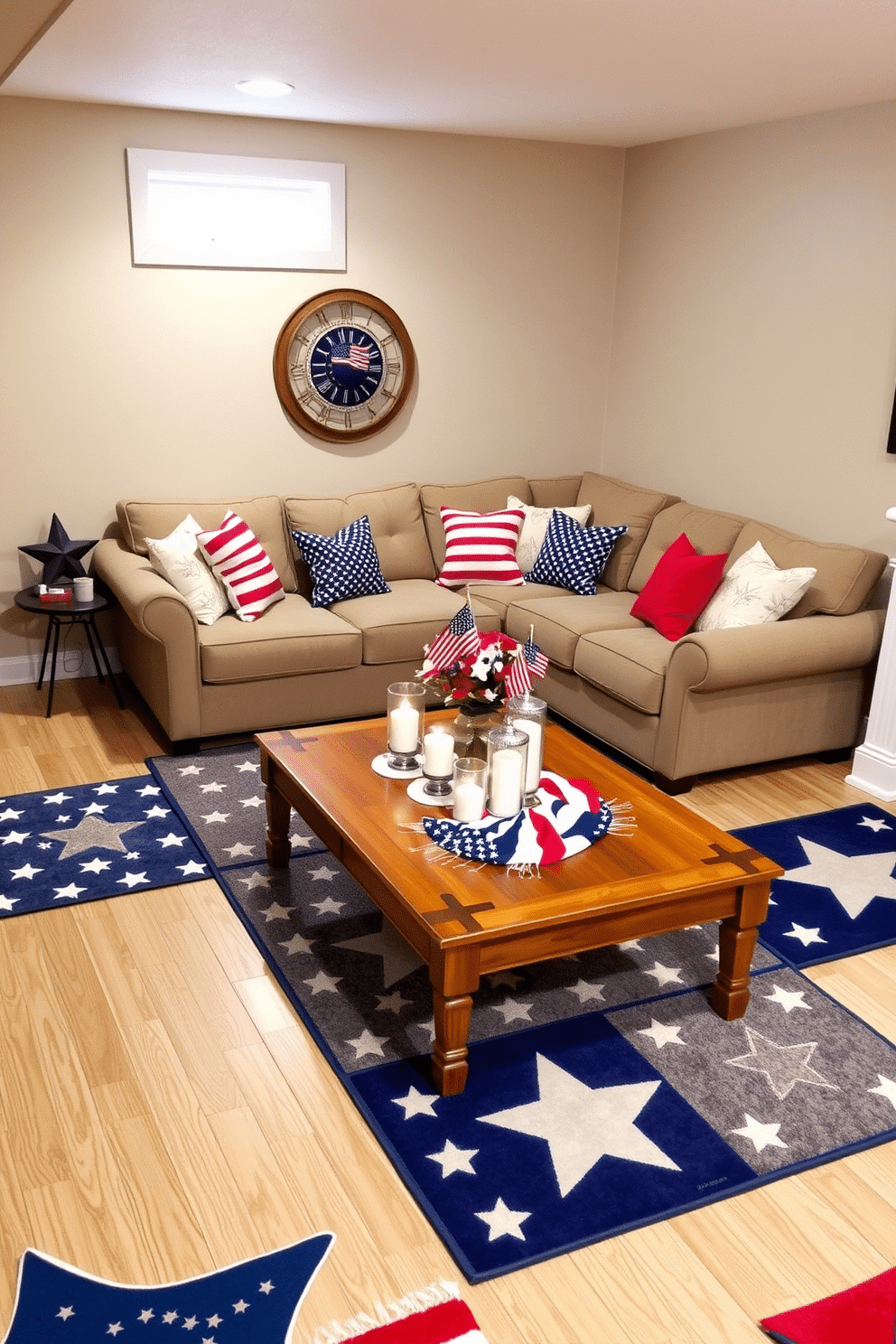 For Memorial Day basement decorating ideas, the space is adorned with red, white, and blue accents throughout. A cozy seating area includes patriotic throw pillows and a coffee table decorated with themed centerpieces and candles.