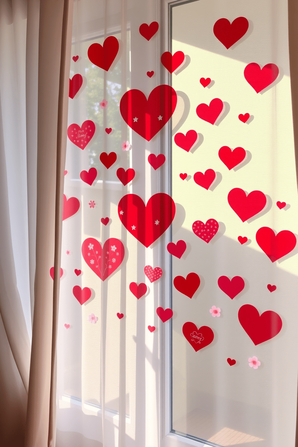 Delicate floral patterns complement the heart shapes, enhancing the romantic theme. Soft, sheer curtains frame the window, allowing natural light to filter through and illuminate the cheerful decorations.