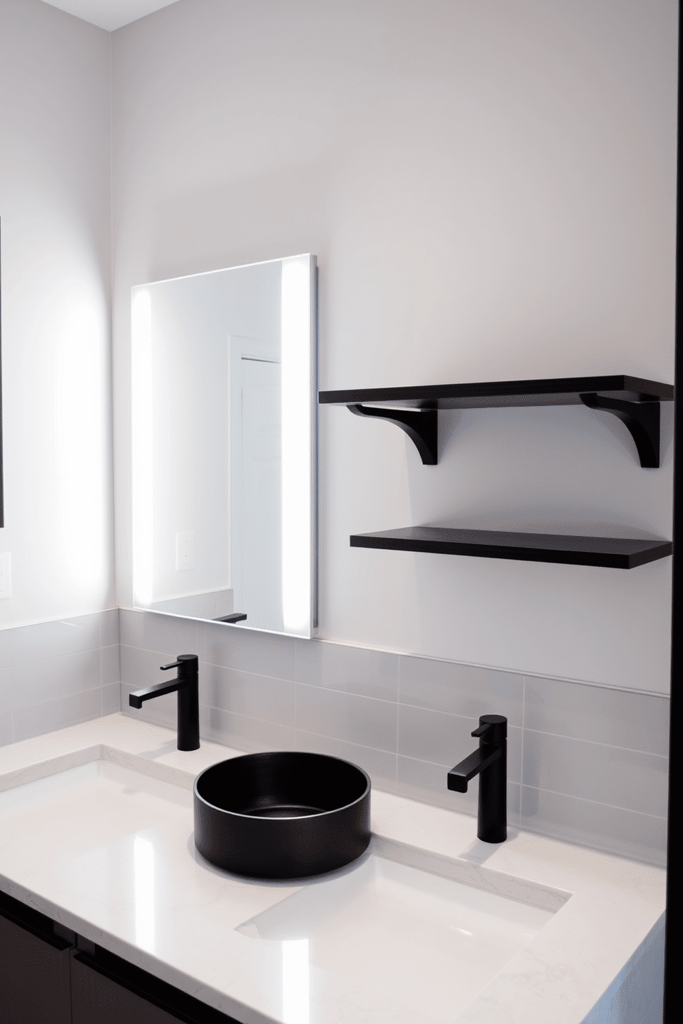 A sleek and functional bathroom with a contemporary touch. The space features backlit mirrors with anti-fog technology, casting a soft glow against a light gray tiled backsplash for a serene ambiance.