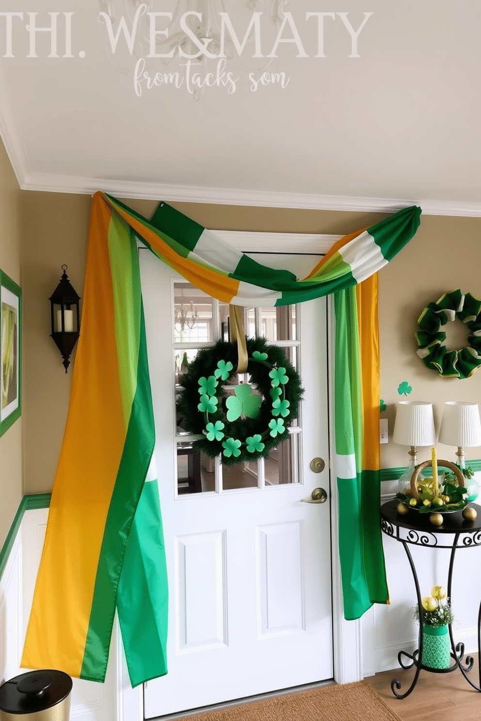A festive entryway adorned with Irish flag bunting that drapes gracefully across the doorframe, creating a vibrant welcome for guests. The walls are decorated with green and gold accents, complemented by a charming wreath made of shamrocks and a small table featuring a collection of St. Patrick’s Day decorations.
