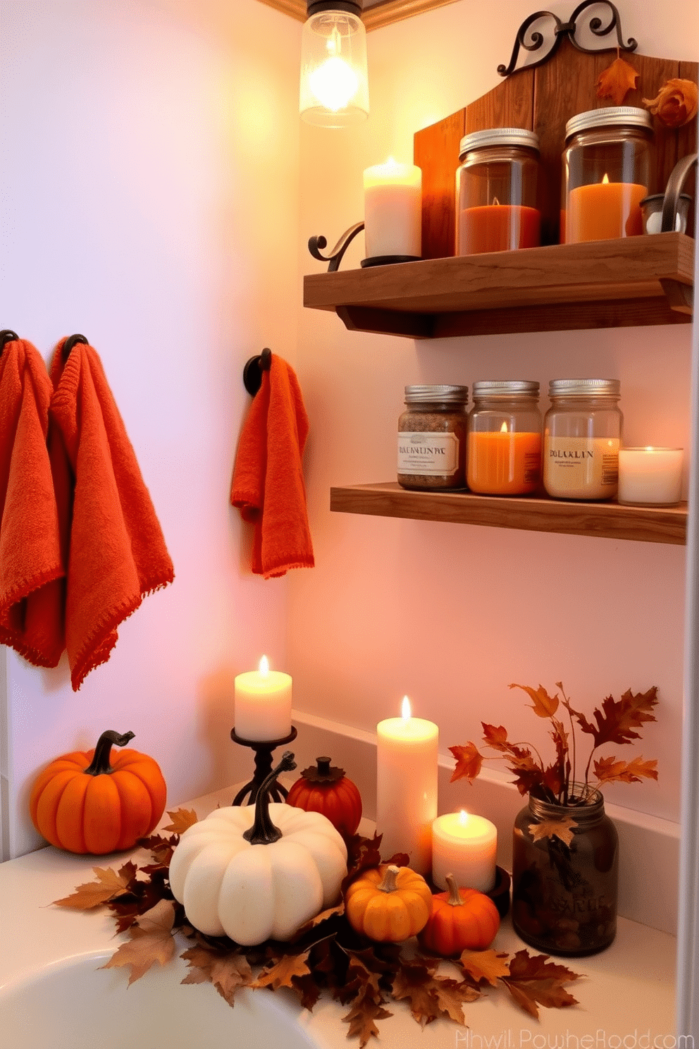 A cozy bathroom adorned with pumpkin spice scented candles creating a warm and inviting ambiance. The decor features autumn-themed accents such as small pumpkins and dried leaves arranged on the countertop.