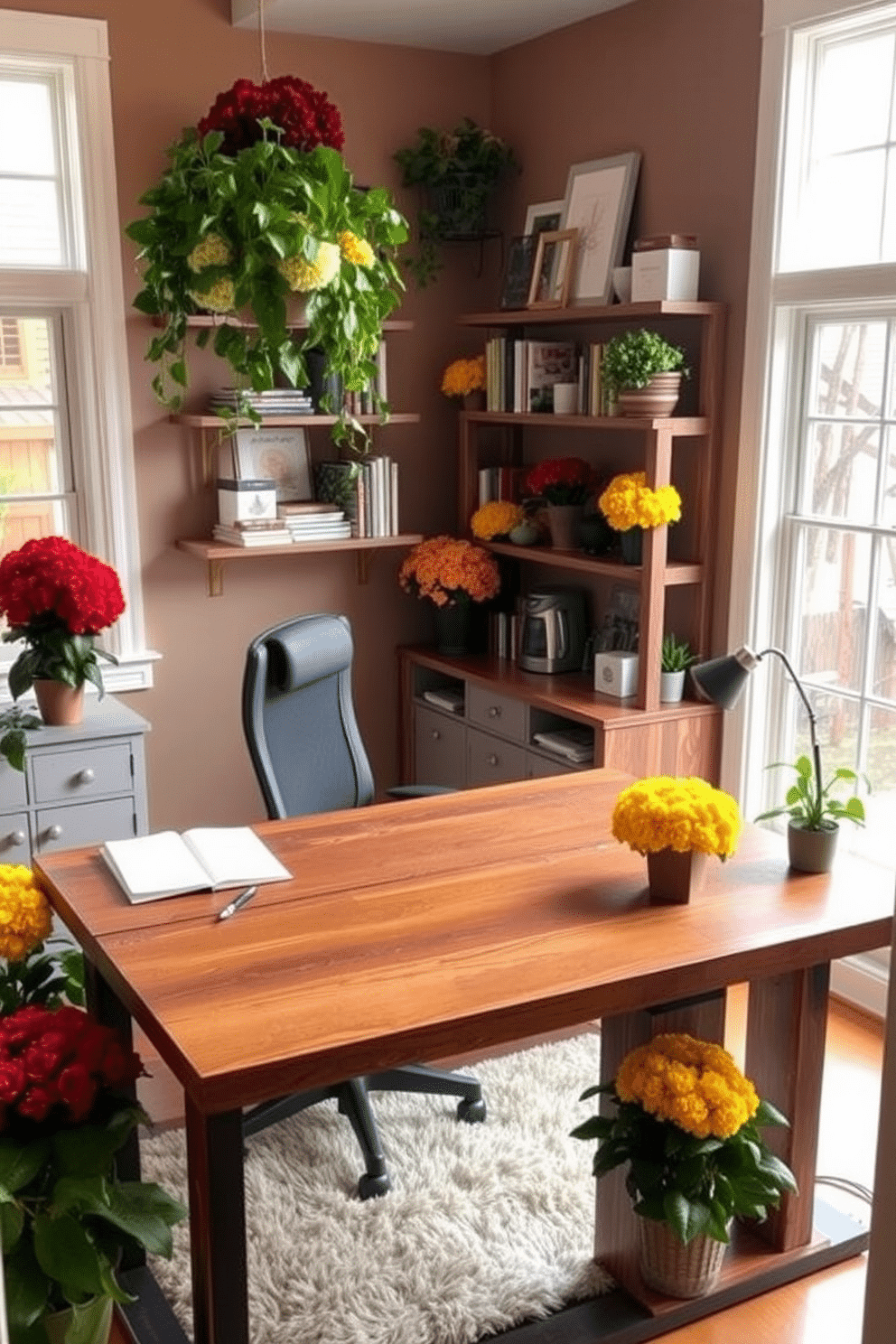 A cozy home office adorned with seasonal plants like vibrant mums in various colors. The desk is made of reclaimed wood, paired with a comfortable ergonomic chair, and the walls are painted a warm taupe to create an inviting atmosphere.