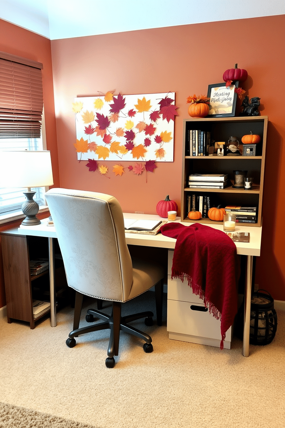 A cozy home office space designed for autumn. The walls are adorned with warm earth tones and the desk is decorated with craft paper featuring autumn leaves and pumpkins.