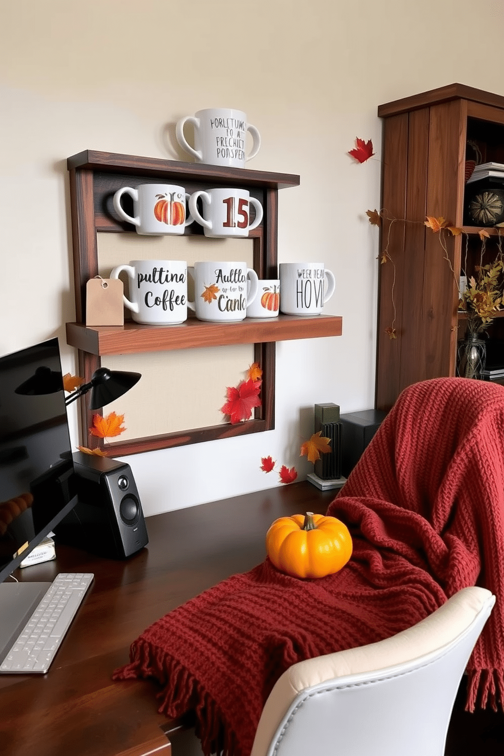 A cozy fall home office setting. There are seasonal coffee mugs displayed on a rustic wooden shelf, each featuring autumn-themed designs.