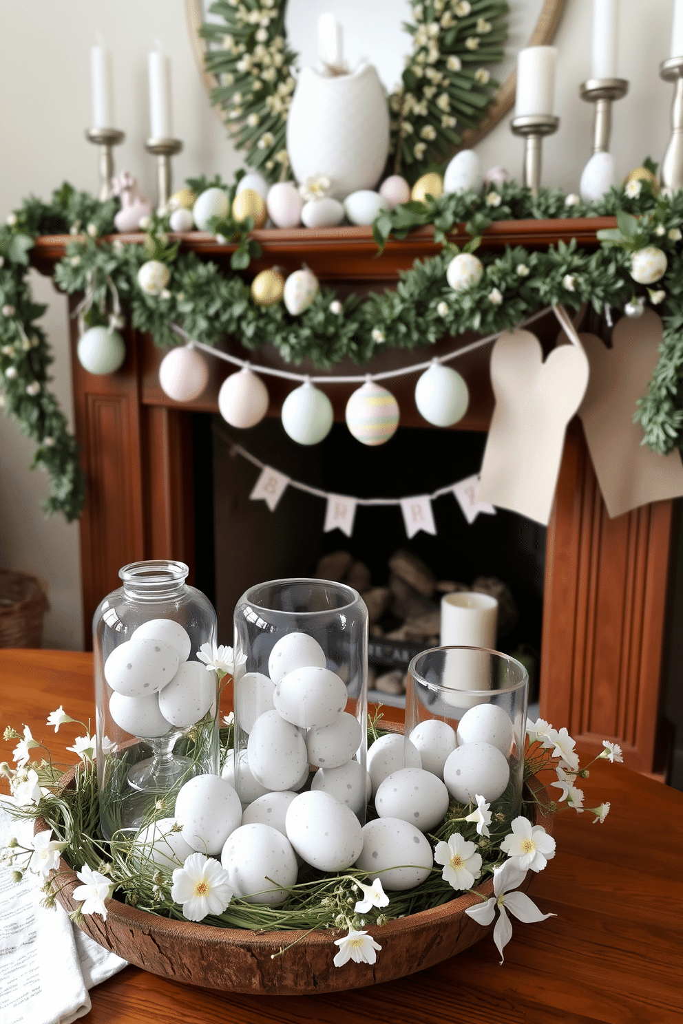 A charming Easter display featuring speckled eggs nestled in elegant glass jars of varying heights. The jars are arranged on a rustic wooden table, surrounded by soft greenery and delicate spring flowers for a fresh, seasonal touch.