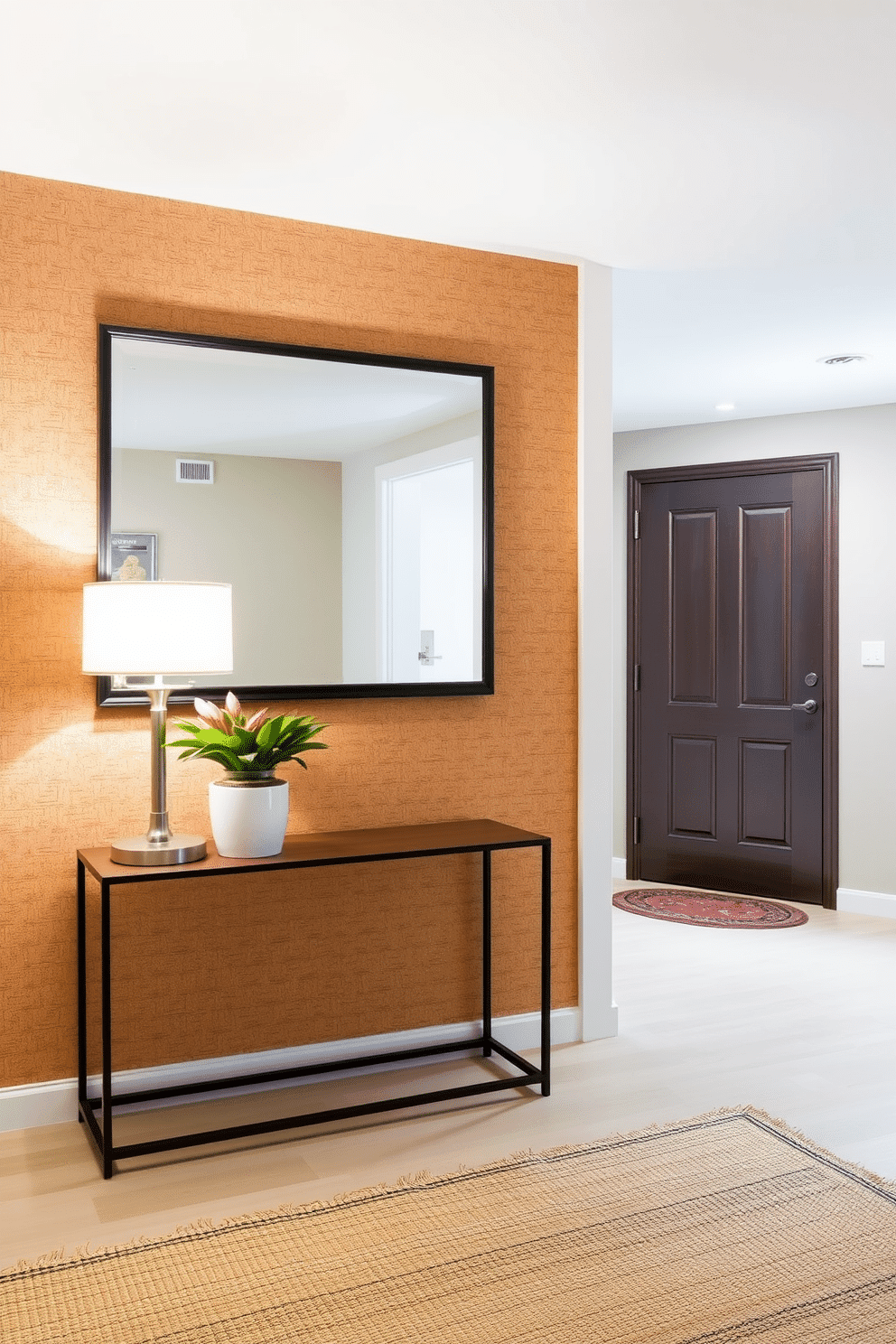 On one side of the foyer, a statement wall showcases a geometric pattern created with contrasting paint colors, enhancing the visual appeal. A sleek console table is positioned against the wall, topped with decorative accents and a large mirror that reflects the light.