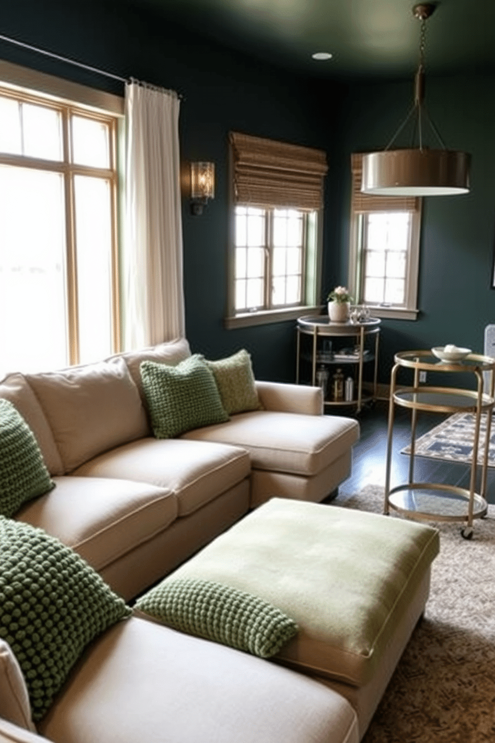 Textured green throw pillows are scattered across a plush, neutral-toned sectional sofa, adding a touch of comfort and style to the space. Natural light filters in through large windows, illuminating the cozy atmosphere created by the warm wooden accents and soft area rugs. The basement design features an inviting lounge area with deep green walls that evoke a sense of tranquility. A sleek bar cart sits in one corner, complemented by modern pendant lighting that enhances the sophisticated yet relaxed vibe of the space.