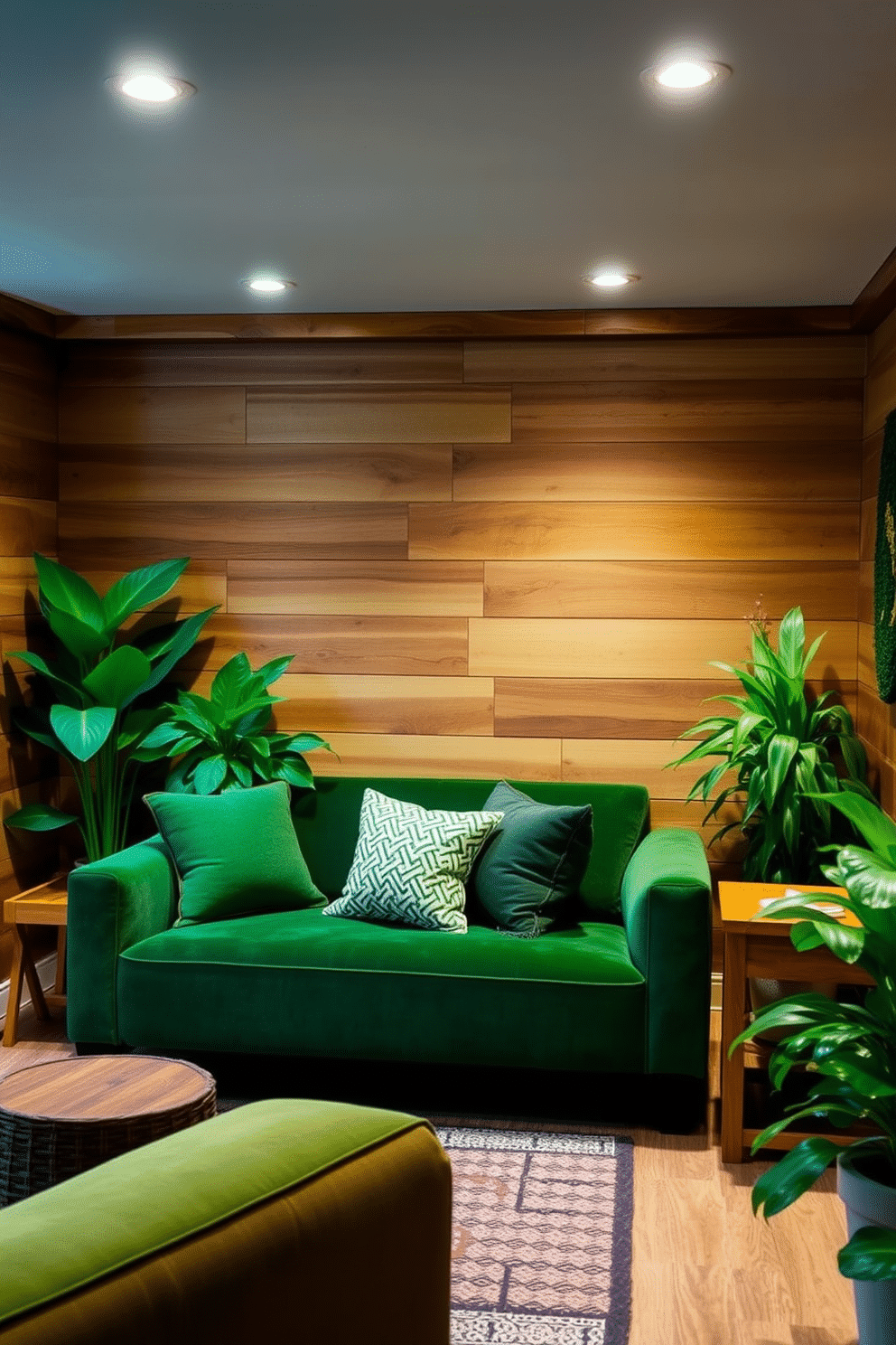 A cozy basement retreat featuring natural wood accents and lush green decor. The walls are clad in warm wooden panels, while vibrant green plants are strategically placed to bring life to the space. A stylish seating area includes a plush green sofa paired with wooden side tables. Soft lighting from recessed fixtures creates an inviting atmosphere, highlighting the natural textures of the wood and the richness of the greenery.