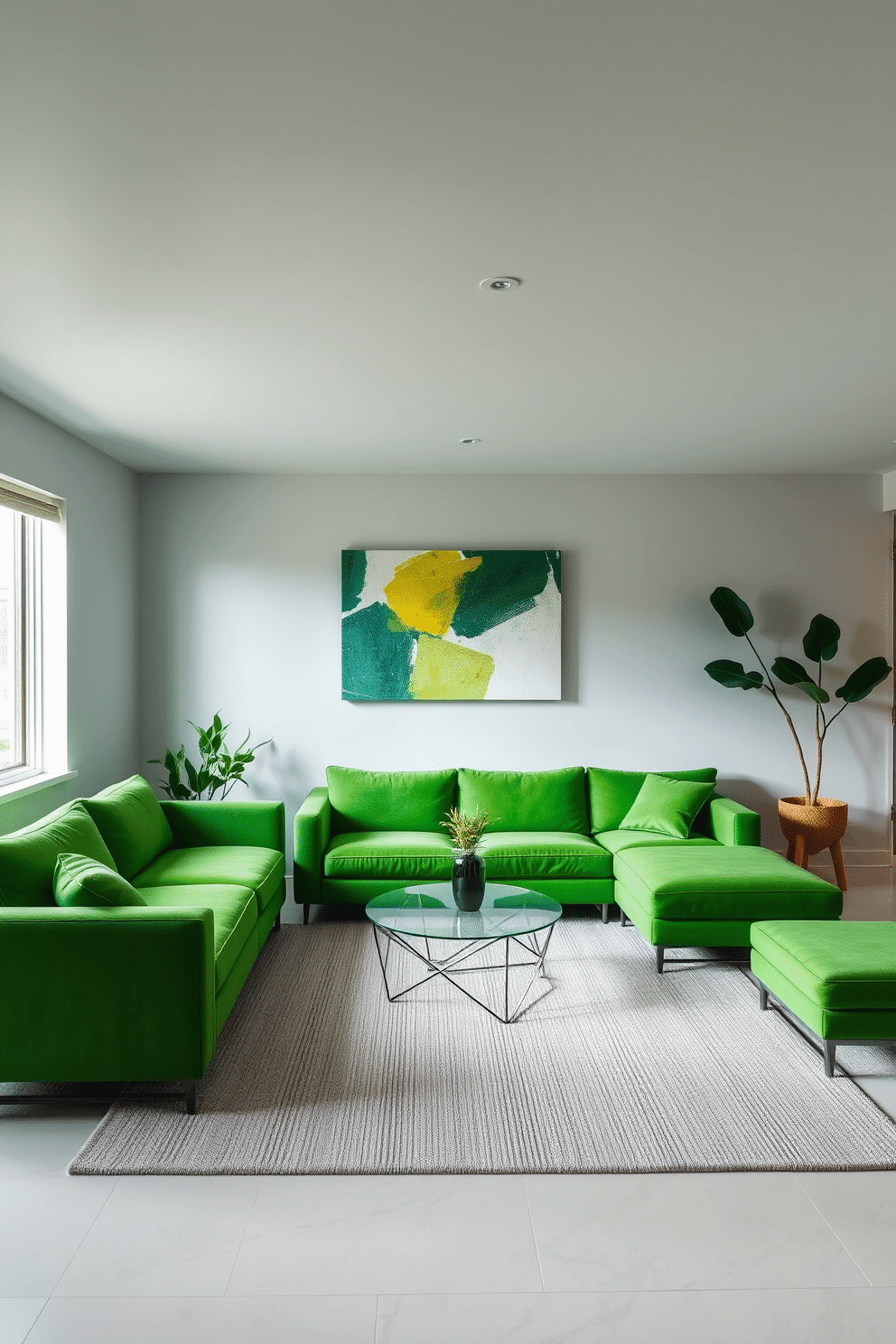 A contemporary basement design featuring green furniture with sleek lines. The space is filled with natural light, showcasing a minimalist aesthetic with a plush green sofa and a geometric coffee table. The walls are painted in a soft gray, creating a calming backdrop for the vibrant furniture. Decorative elements include a large abstract painting and indoor plants that add a touch of nature to the modern interior.