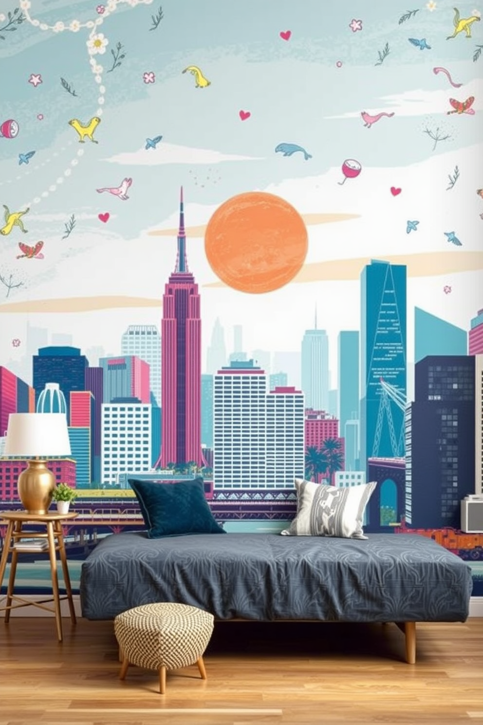 Graphic cityscapes for urban flair. Imagine a vibrant living room featuring a large mural of a bustling city skyline, with skyscrapers and bridges in bold colors.