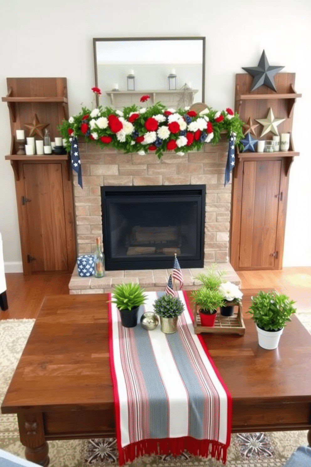 Incorporate a mix of red, white, and blue accents to enhance the festive feel. Surround the fireplace with small potted plants and candles to add a touch of natural beauty to the rustic decor.