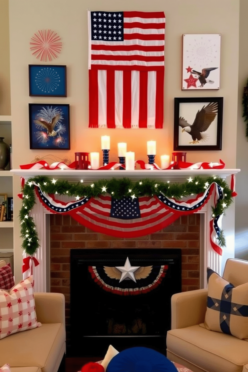 The fireplace is adorned with garlands of greenery interspersed with small American flags. Candles in coordinating colors are placed within the vases, adding warmth and ambiance to the space.