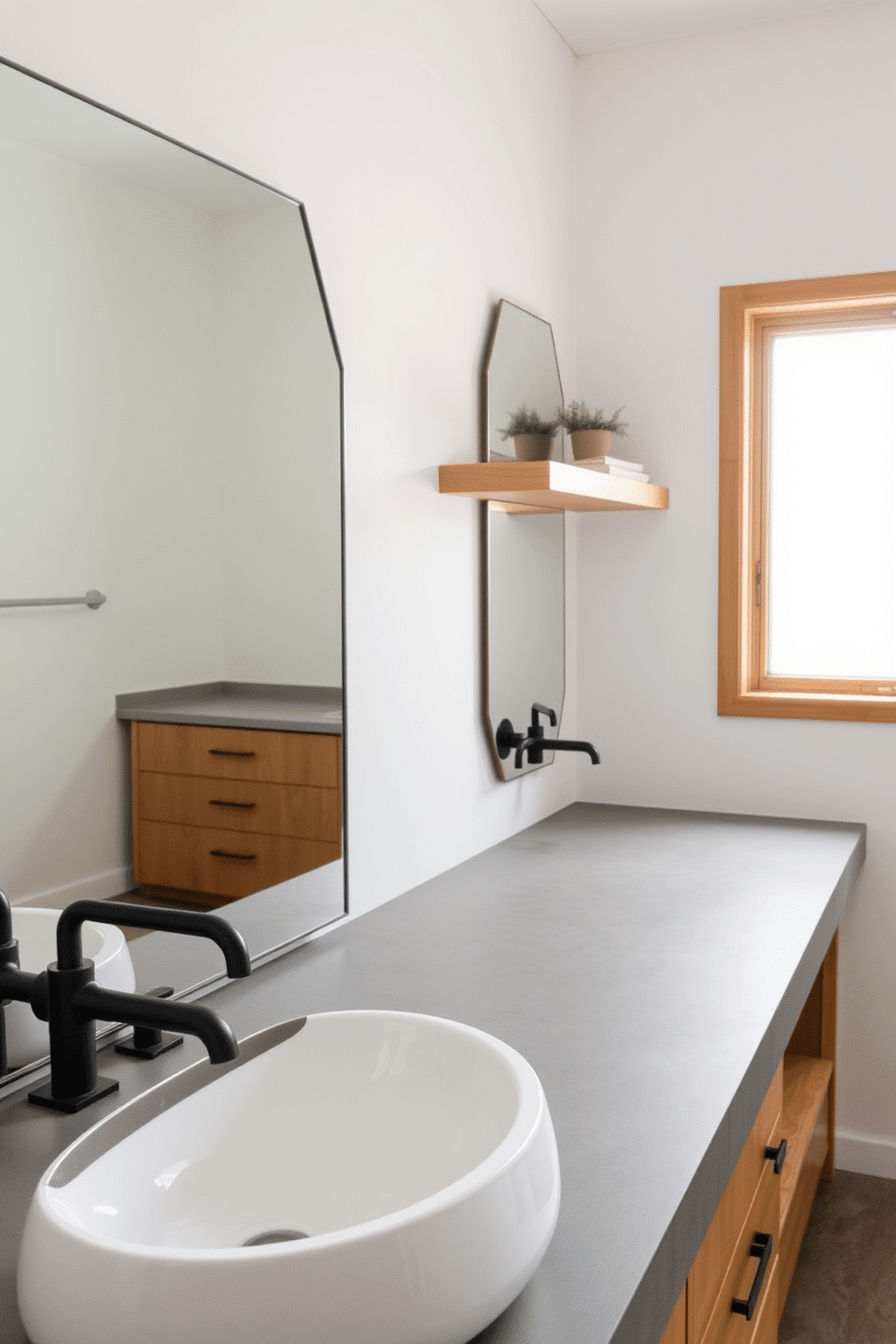 A contemporary bathroom with concrete countertops that exude industrial charm, perfectly complemented by sleek white vessel sinks. The matte finish of the countertops contrasts beautifully with the glossy surfaces of the vessels, creating a refined balance.