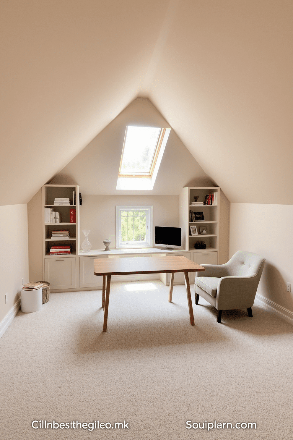 A serene attic office designed with a neutral color palette to evoke tranquility. The walls are painted in soft beige, complemented by a light gray carpet that adds warmth to the space.