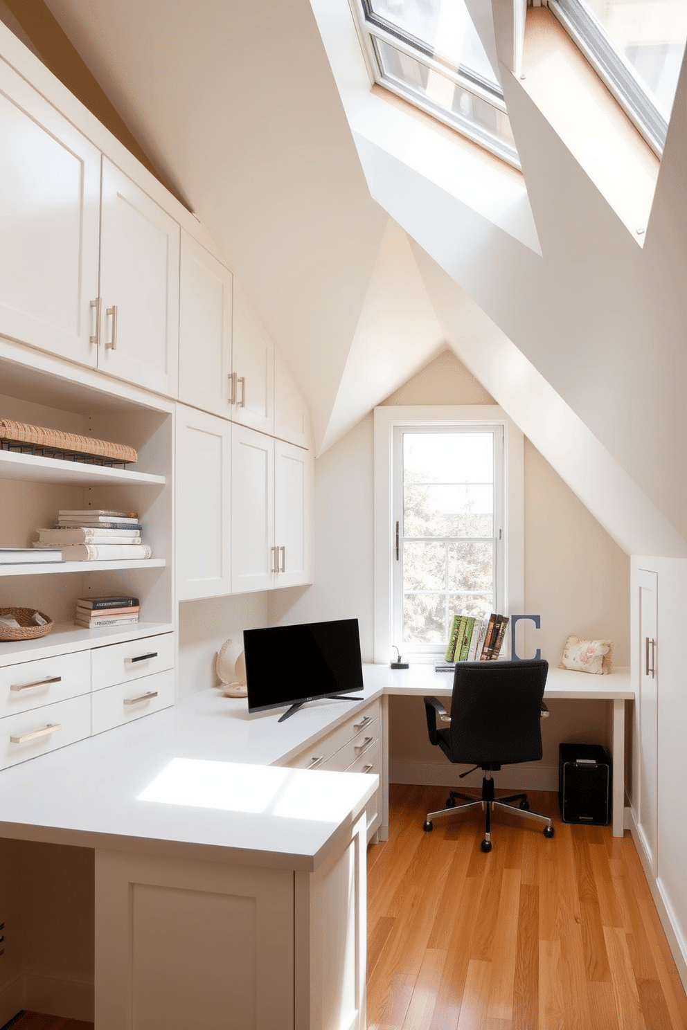 Attic Office Design Ideas. Visualize a bright and airy attic office with sloped ceilings and skylights that bring in natural light. A sleek, modern desk is positioned near a window, surrounded by built-in shelves filled with books and decorative items, creating an inspiring workspace.