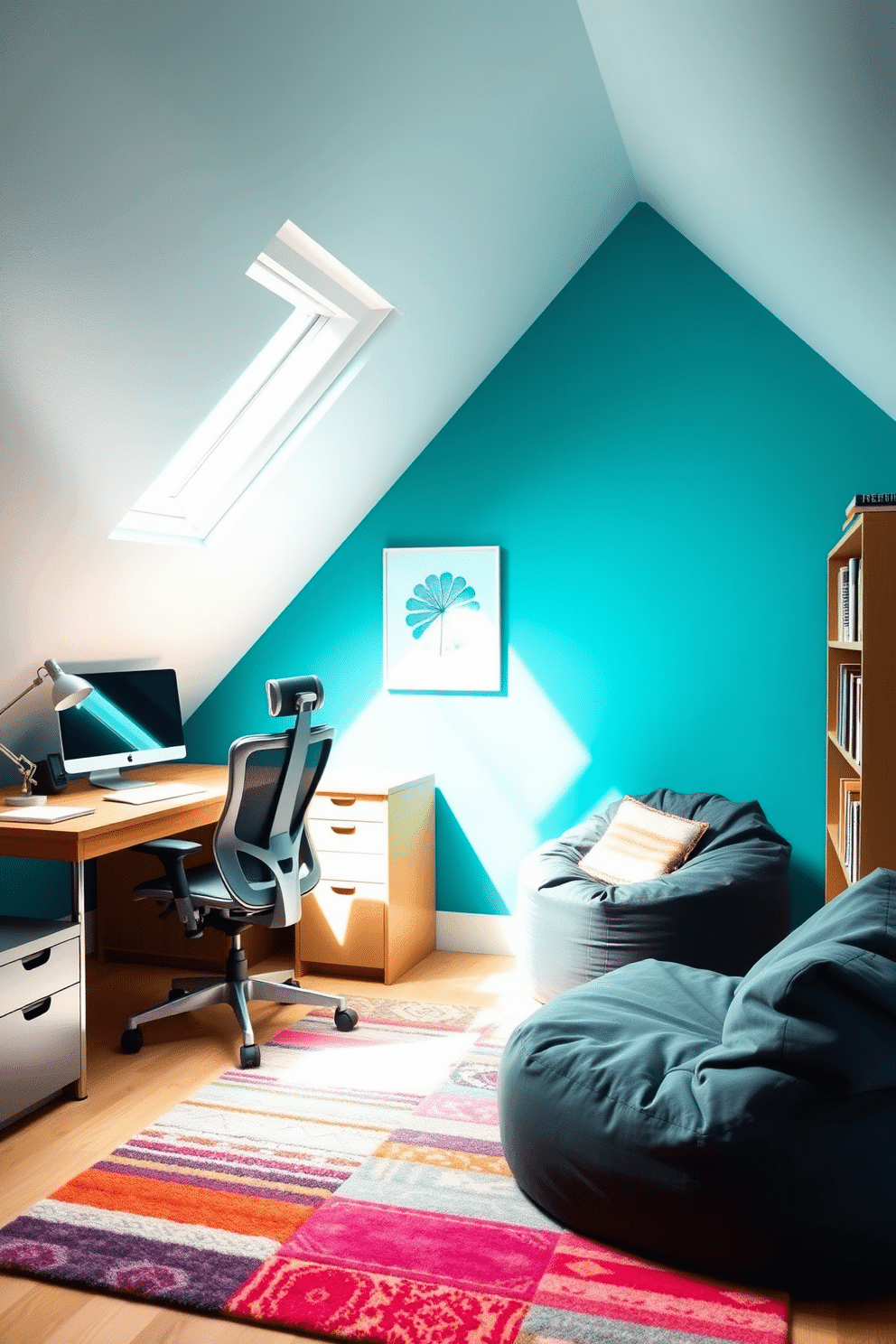 A vibrant attic office space featuring a colorful accent wall painted in bright teal, creating an energetic atmosphere for creativity. The room is filled with natural light from a skylight, illuminating a sleek wooden desk paired with a modern ergonomic chair.