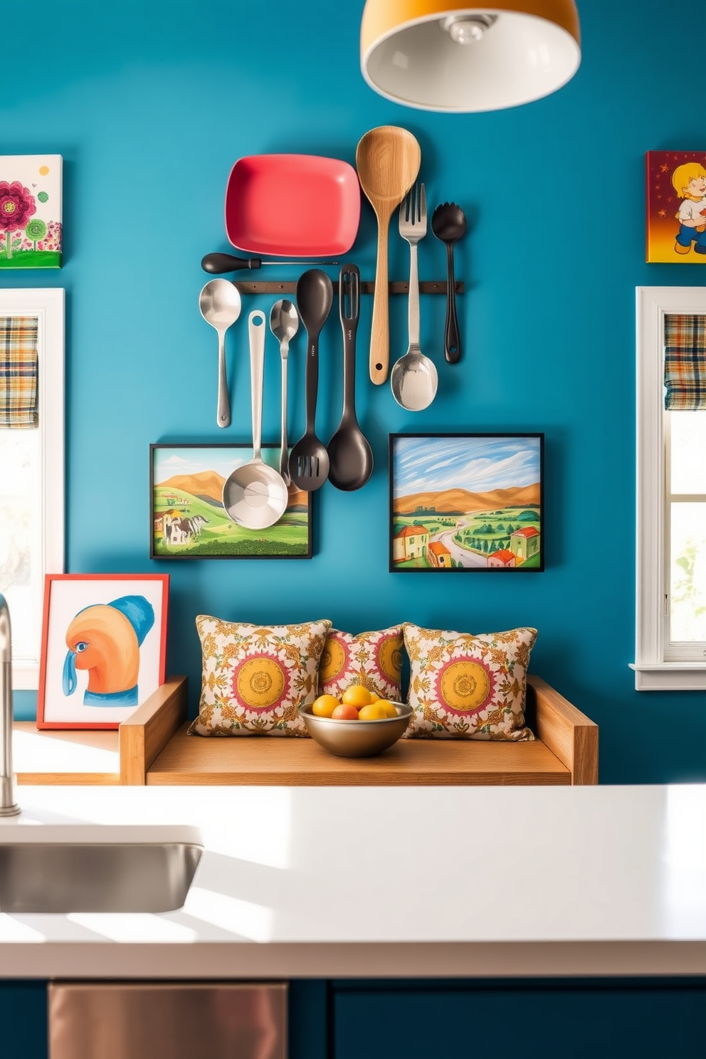 A vibrant kitchen setting featuring a playful arrangement of kitchen utensils as wall art. The breakfast nook is adorned with colorful paintings that bring a cheerful atmosphere to the space.