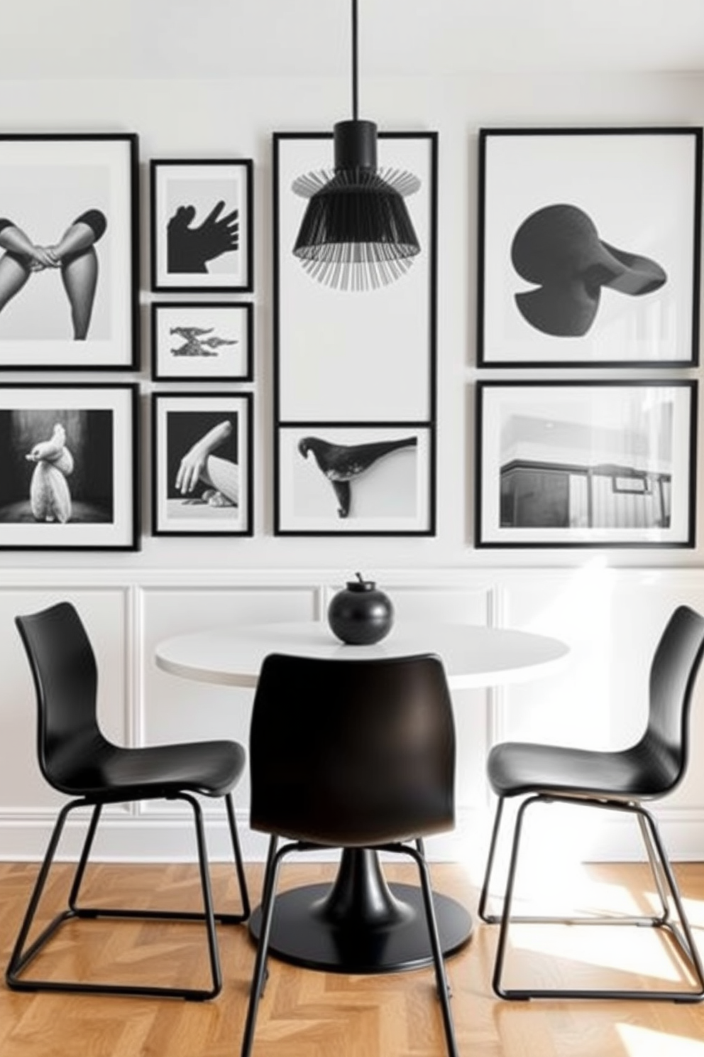 Incorporate a gallery wall with various black and white prints framed in thin black frames. A statement piece above the table serves as a focal point, drawing attention to the minimalist design.