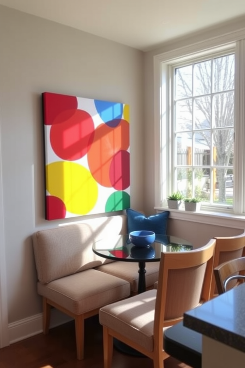 Create a cozy breakfast nook featuring a round wooden table surrounded by upholstered chairs. The walls are adorned with abstract paintings in bright colors, adding a vibrant touch to the space.