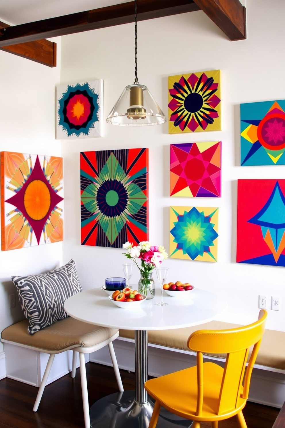 A vibrant breakfast nook adorned with colorful geometric patterns on canvas. The walls are painted in a soft white, allowing the artwork to pop and create an inviting atmosphere.