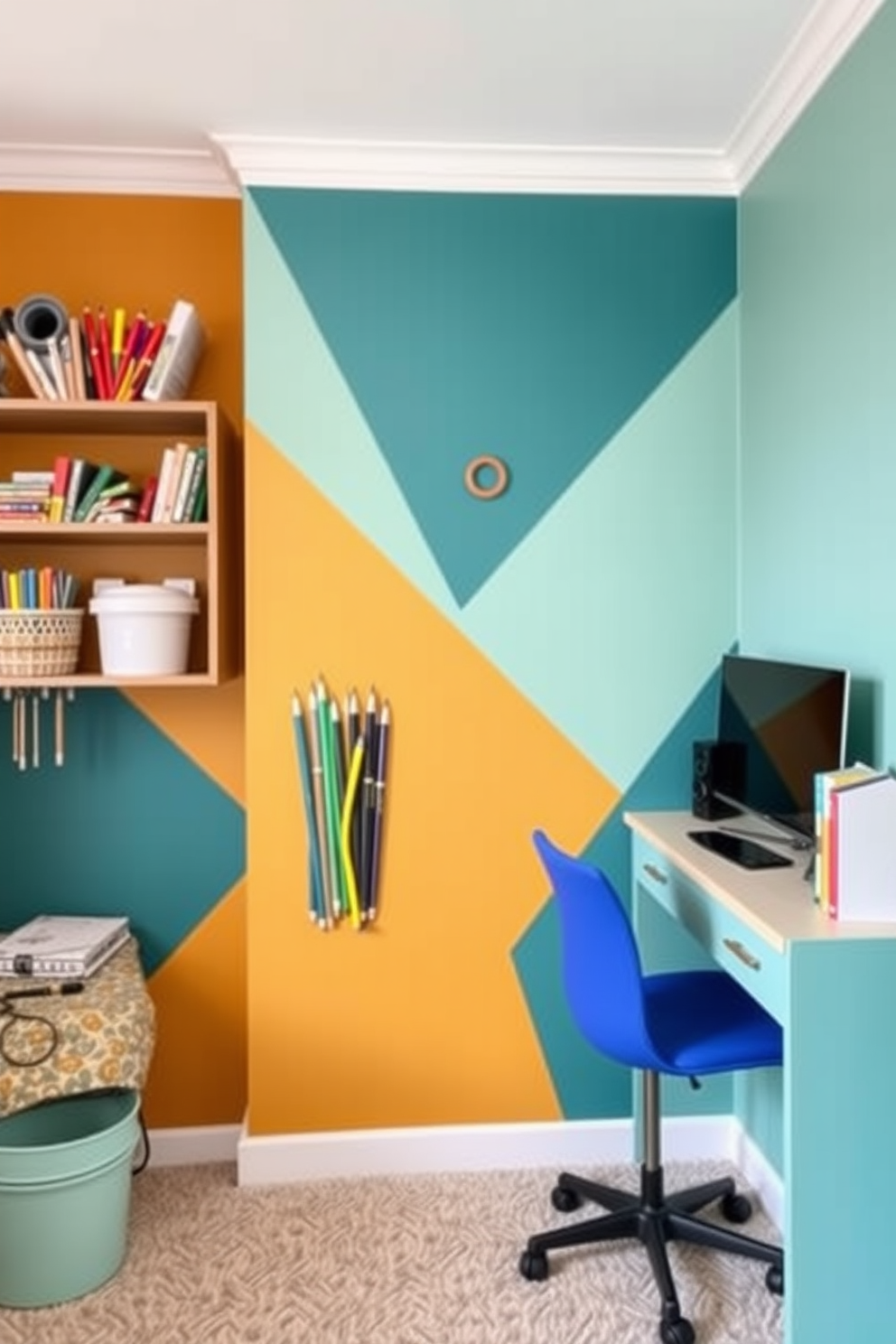 Color blocking for a contemporary look. The walls are divided into bold geometric shapes featuring contrasting colors like teal and mustard yellow.