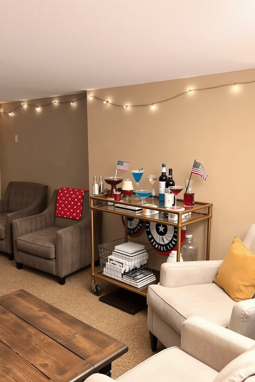 The basement is transformed into a cozy gathering space decorated with patriotic bunting and string lights. Comfortable seating is arranged around a central coffee table that showcases additional festive snacks and drinks.