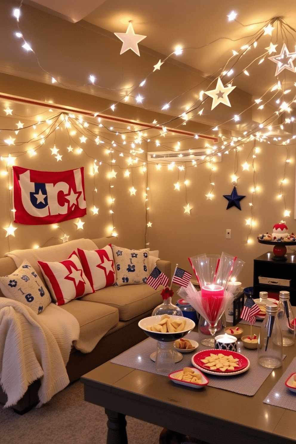 A cozy basement setting adorned with star shaped fairy lights creates a warm and inviting atmosphere for Independence Day celebrations. The lights are draped along the ceiling and walls, casting a soft glow that enhances the festive decor.