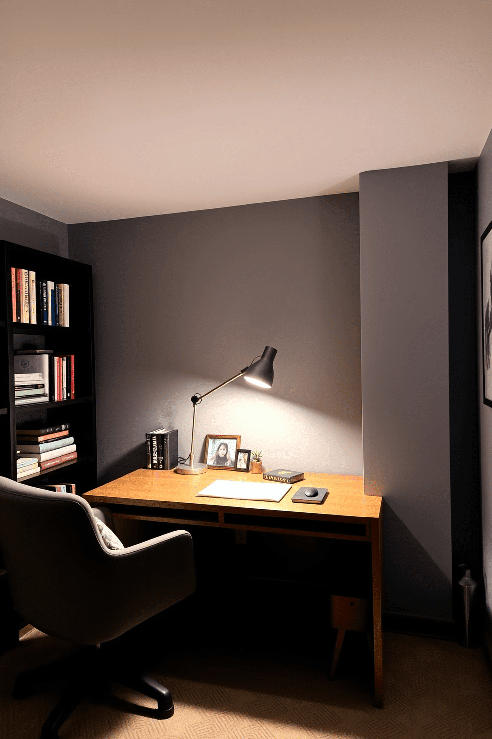 A cozy small study room featuring layered lighting that includes a stylish desk lamp on a sleek wooden desk. The walls are painted in a soft gray, complemented by a comfortable chair and a bookshelf filled with books and personal decor.