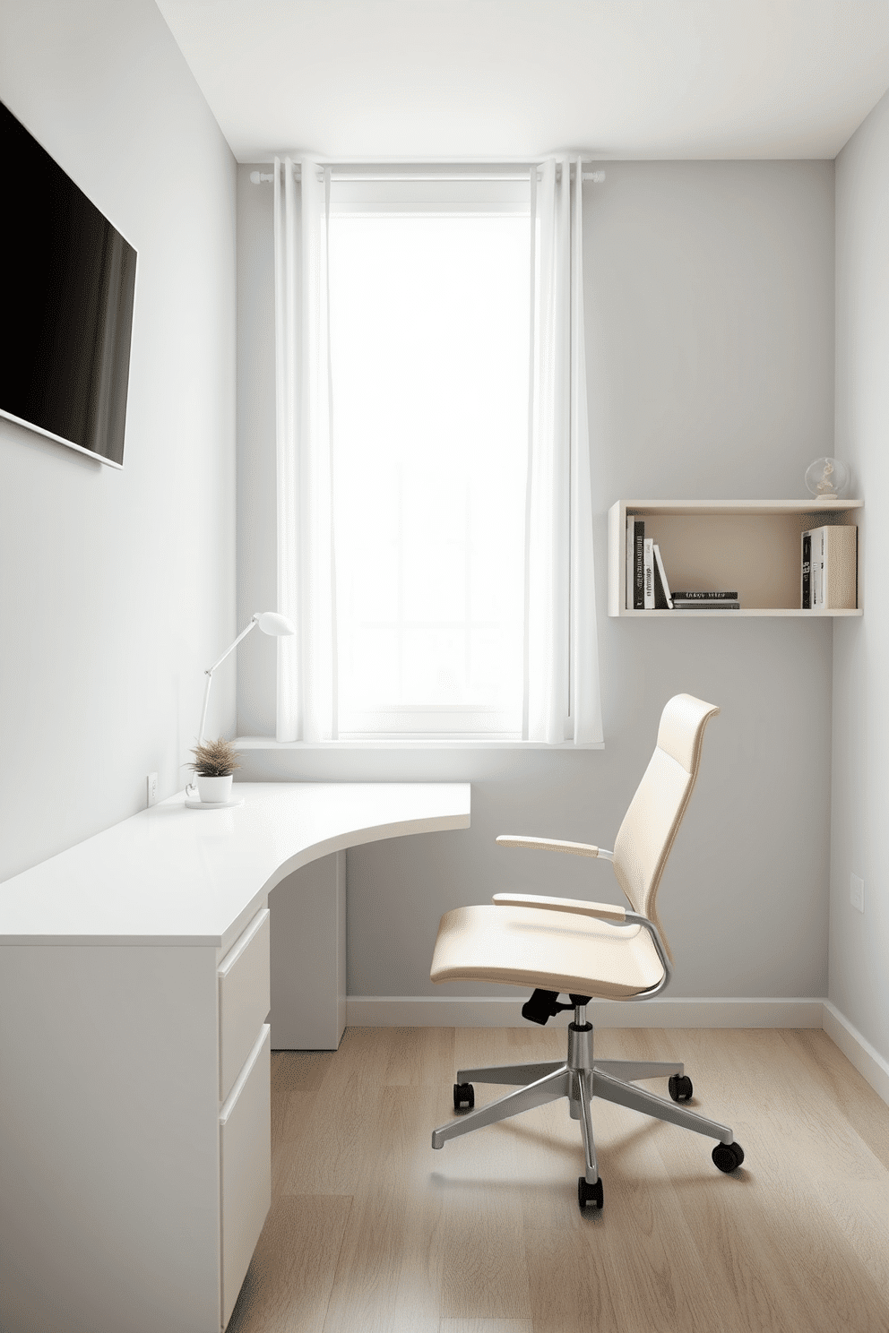 A minimalist study room featuring a sleek, white desk with clean lines positioned against a light gray wall. A comfortable ergonomic chair in soft beige complements the space, while a small potted plant adds a touch of greenery on the desk.