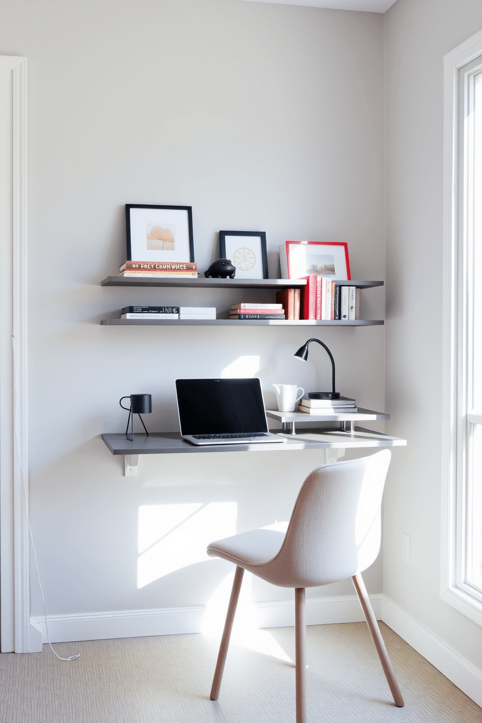 A sleek wall-mounted desk is positioned against a light gray wall, maximizing floor space while providing a functional workspace. Above the desk, floating shelves display books and decorative items, adding both style and storage to the small study room.