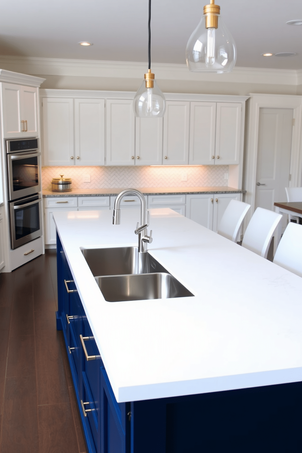 The design is enhanced with pendant lighting above the island, casting a warm glow over the seating area. A subtle color palette of white, navy blue, and gold accents creates a refined and inviting atmosphere that complements the surrounding cabinetry and stainless steel appliances.