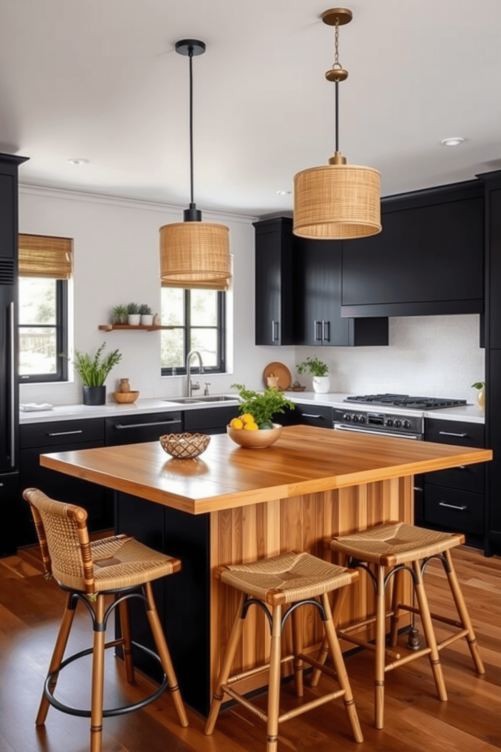Above the island, pendant lights with natural fiber shades provide soft illumination, complementing the natural materials. A set of vintage barstools with woven seats adds texture, while a fruit bowl and potted herbs on the countertop emphasize the organic feel.
