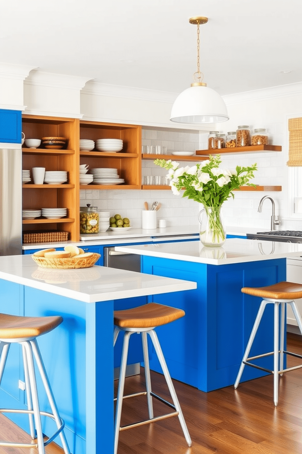 A vibrant kitchen setting featuring a boldly colored island, painted in a striking shade of cobalt blue. The island boasts open shelving on one side, showcasing neatly arranged dishware and glass jars filled with pantry essentials.